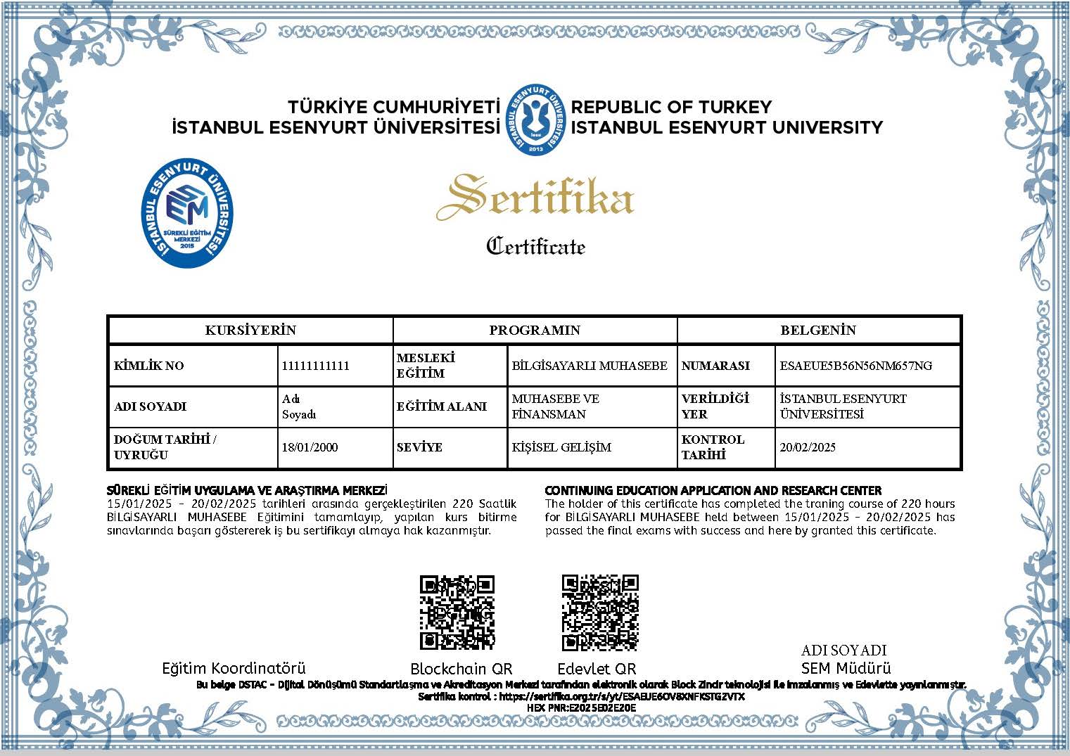 Bilgisayarlı muhasebe kursu sonunda gireceğiniz sınav sonucunda ömür boyu geçerli uluslararası geçerliliğe sahip E-Devlet portalına işlenen resmi bir sertifikaya sahip olacaksınız.